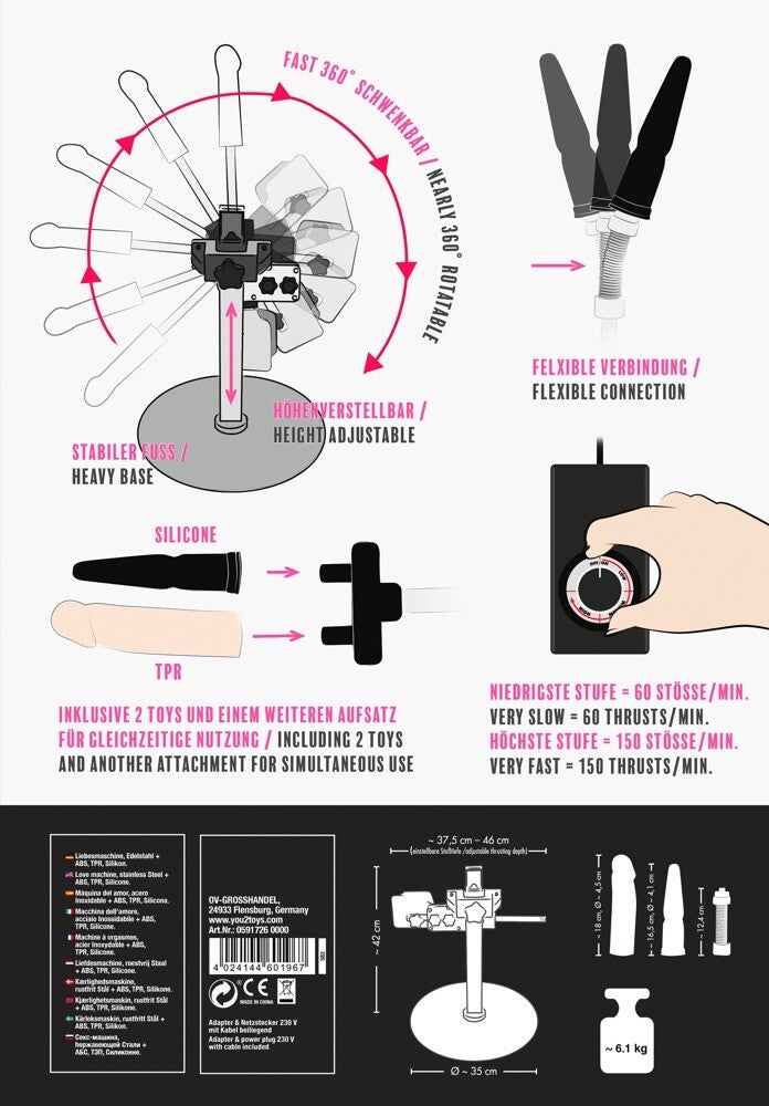 Gesamtlänge Ständer 42 cm, Naturdildo 18 cm, Analdildo 16,5 cm. Edelstahl, ABS, Silikon, TPR